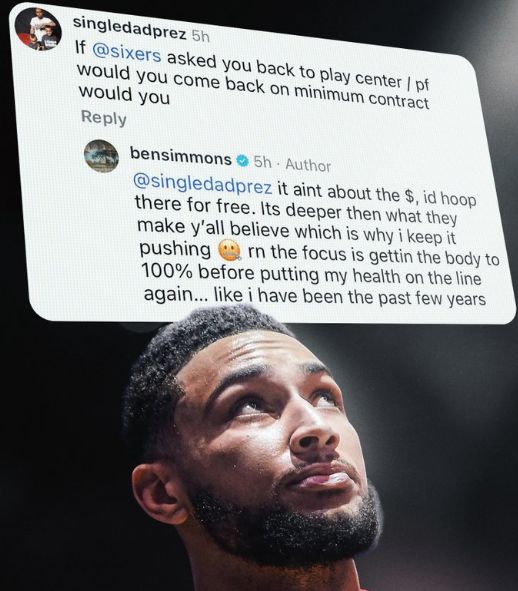 西蒙斯则回复“兄弟,现在不是钱的问题, 我可以不要钱去那儿打球,但事情比他们让你们相信的要复杂,这就是为什么我选择继续前进。现在的重点是再次拿我的健康冒险之前,先把身体恢复到100%,就像过去几年我一直做的那样。” ”